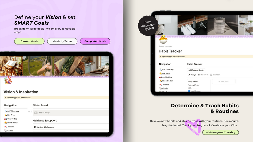 Designed for individuals passionate about personal growth, manifestation, and goal-setting, this beautifully crafted Notion template simplifies the journey to success.