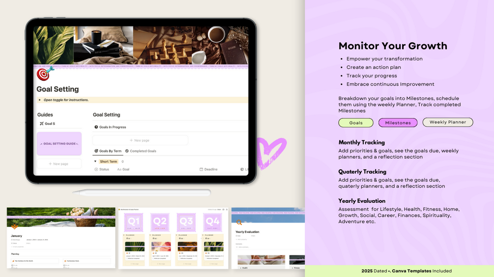 Are you ready to take control of your life and achieve your dreams? This Notion Goal Planner is more than a planner—it’s a life-changing digital productivity tool that empowers you to set meaningful goals, track your progress, and build a life you love.